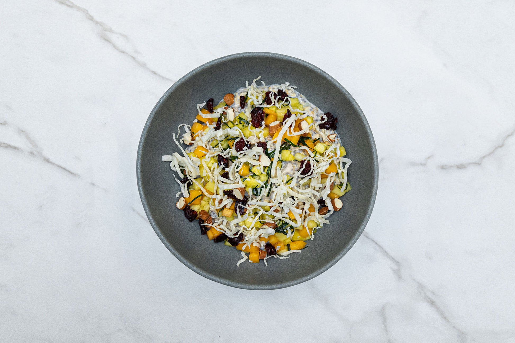 Chia Overnight Oats Topped with Coconut, Pina, and Cranberry