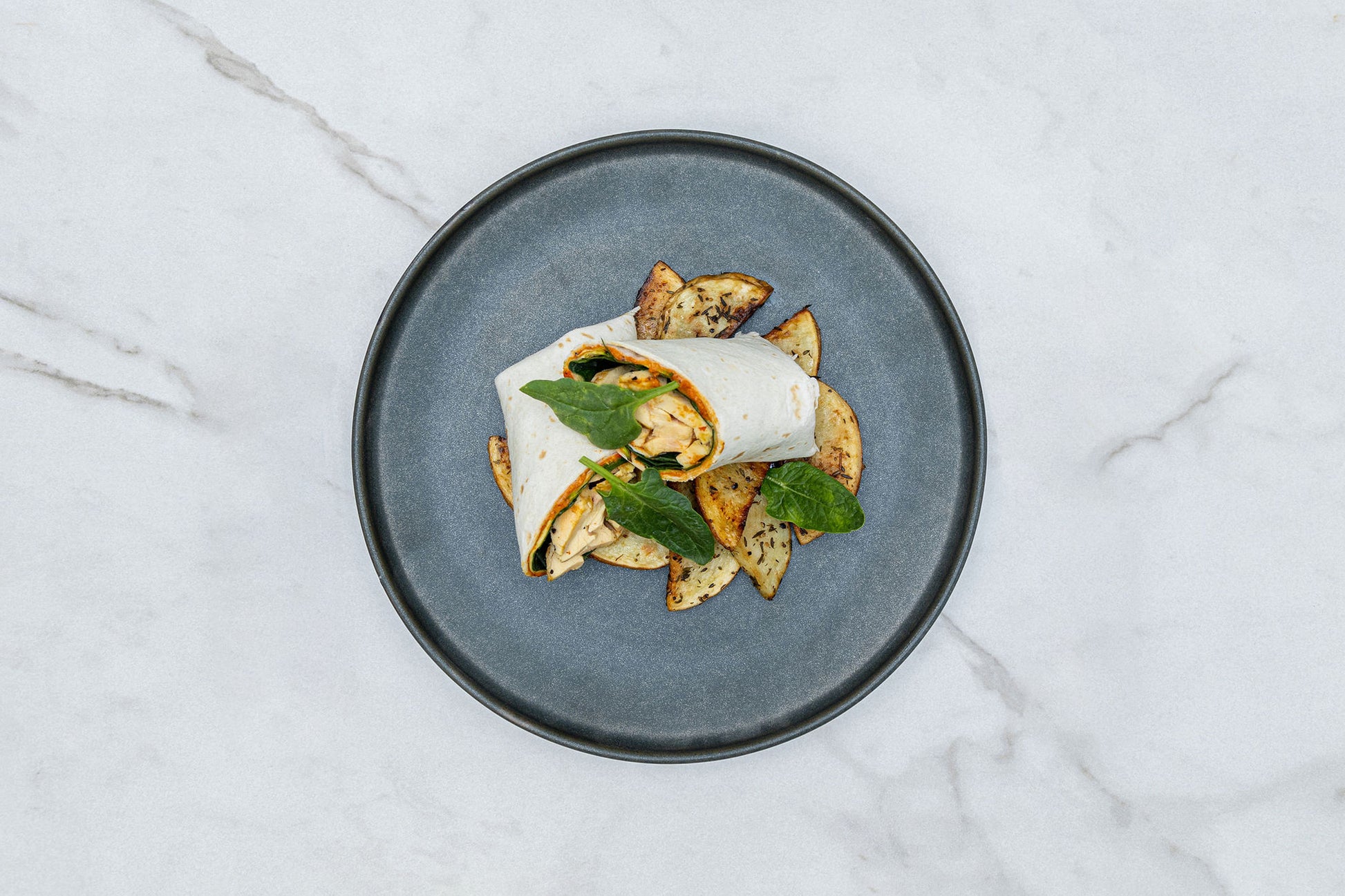 Chicken and Hummus Breakfast Burrito with Side of Breakfast Potatoes